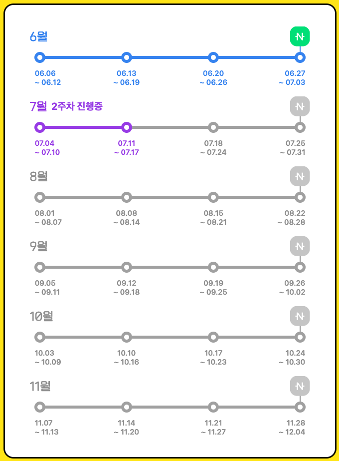 챌린지 일정 : 6월 6일부터 12월 4일까지, 매주 월요일 00:00 ~ 일요일 23:59