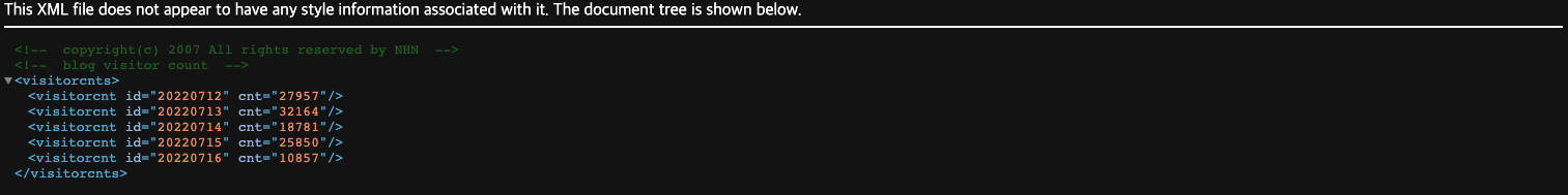 네이버 블로그는 방문자를 집계해주는 위젯을 기본적으로 제공하고 있습니다. 뺄 수도 있지만 모든 네이버 블로그는 방문자 집계를 최근 5일 치를 API 형태로 저런 식으로 보여주고 있기 때문에 방문자 위젯을 사용하지 않는다고 하더라도