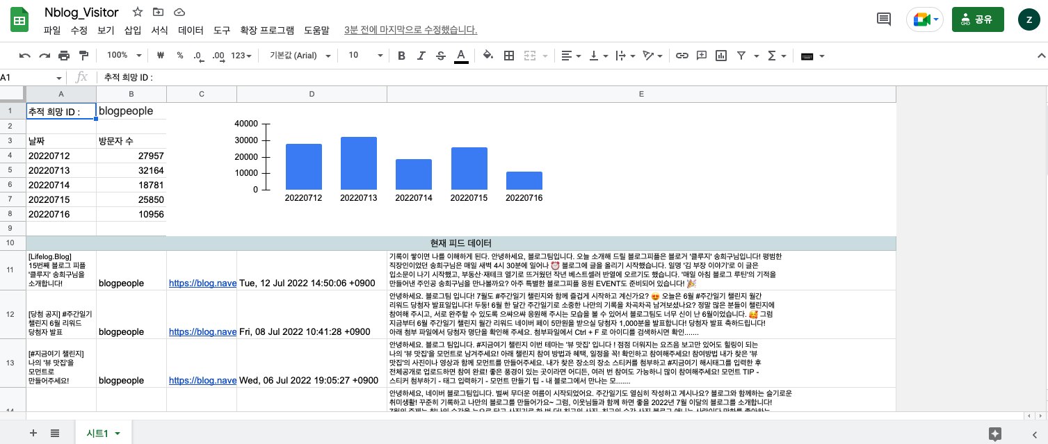 해당 셀에 입력값을 토대로 블로그의 피드 RSS와 방문자 수를 불러오고 있어요~!