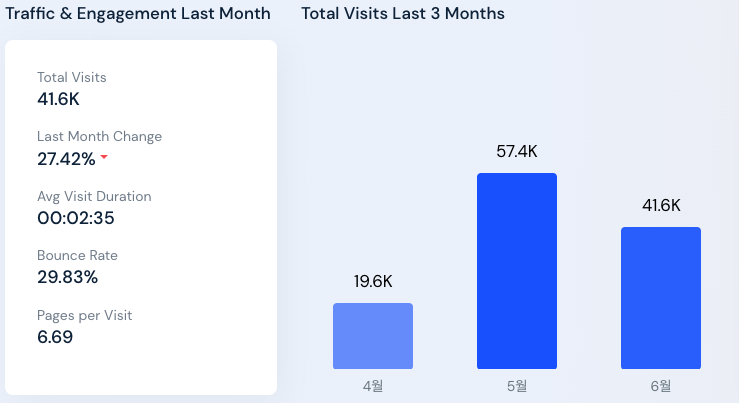 웹사이트 평균 이용 시간은 2분 내외 / 페이지 조회가 6.69 정도인걸로 보아하니 공식 홈페이지가 활발한 것인지 아니면 뭔가 속도나 이슈가 있어서인 건 아닐까?