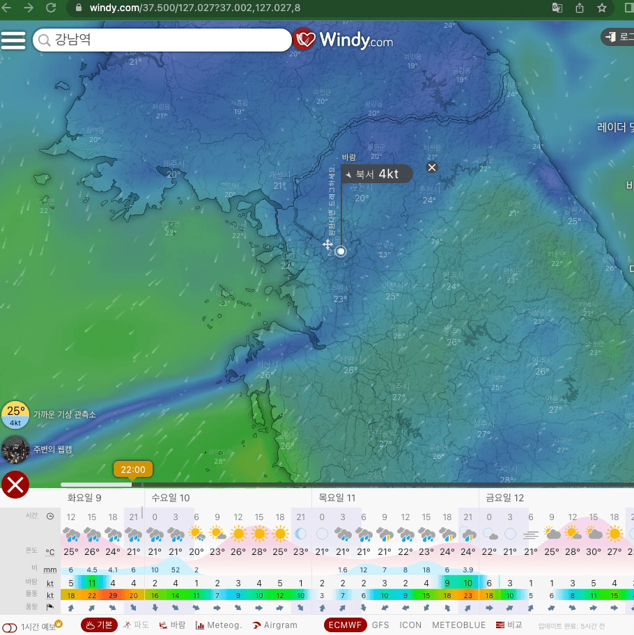 확실히 기상 데이터에 대해 1도 알지 못하는 저라도 시각화된 자료를 보면 음... 내일은 우산을 쓰는 게 현명하겠는 걸 할 정도로 구름의 위치라던가 바람 등에 대한 부분을 너무나 잘 설명하고 있습니다.