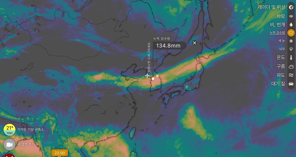 한국뿐만 아니라 세계 전체적으로 확인해볼 수도 있습니다. 확실히 한반도에 걸쳐있는 비구름이 장난 아니네요