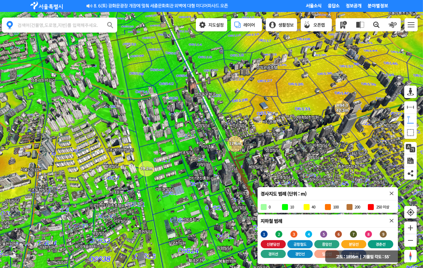 서울시에서 제공하는 3D맵만 살펴보아도 강남역 일대는 표고차가 꽤 큰 것을 확인할 수 있습니다.