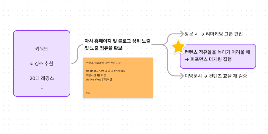 예를 들어 레깅스를 사고싶은 20대 여성이 있다고 가정해보면, 네이버나 네이버 쇼핑에서 레깅스를 검색해보고, 마음에 들지 않는다면 블로그나 "레깅스 추천" 등의 부가적인 검색을 지속할 것이다. 이런 습성을 알고 있는 마케터는 아래와 같은 전략을 구상하게 된다.