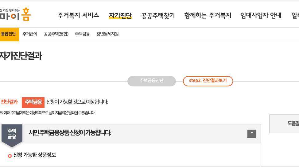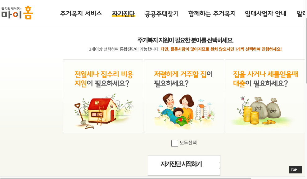 자가진단 메뉴를 통해 현재의 주거 상황 등에 맞춰서 알맞은 내용을 설명해줍니다.