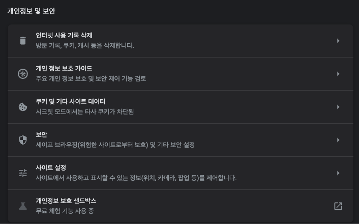 왼쪽에 있는 개인정보 및 보안 탭으로 들어가줍시다.